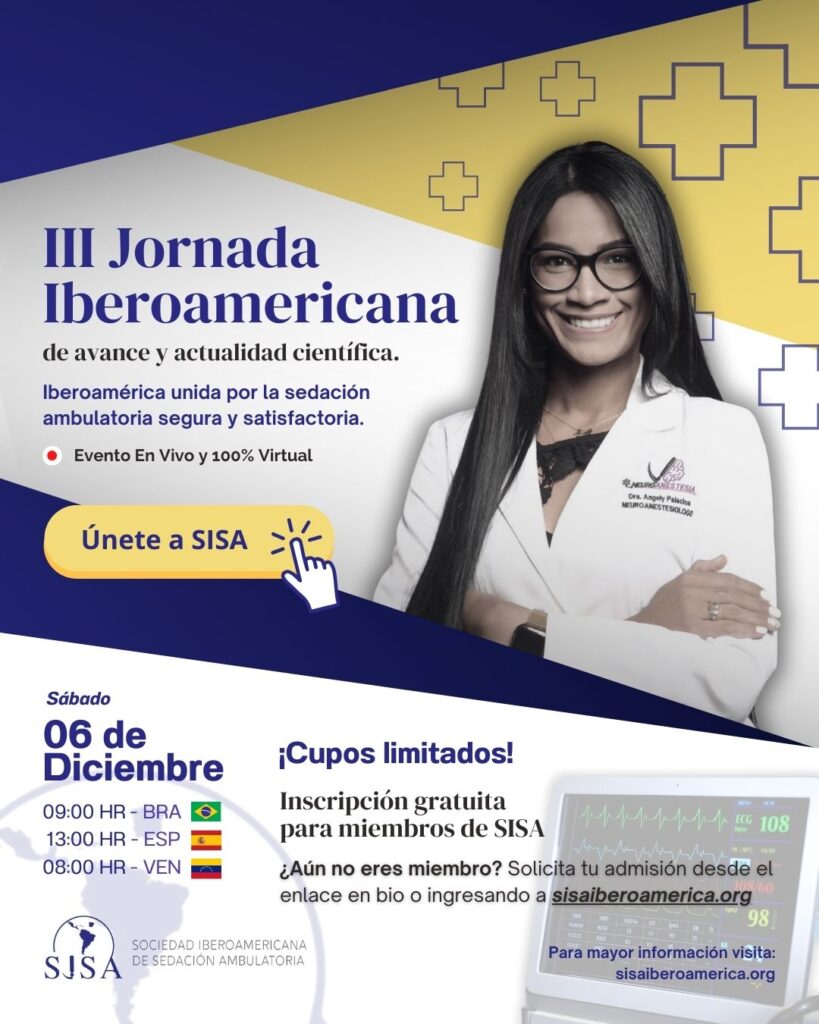 La Sociedad Iberoamericana de Sedación Ambulatoria (SISA) es una organización médica sin fines de lucro que reúne a anestesiólogos y especialistas comprometidos con elevar los estándares de sedación fuera del quirófano en Iberoamérica. A través de formación continua, publicaciones científicas, conferencias y colaboración interdisciplinaria, buscamos promover una atención médica más segura, eficaz y actualizada.